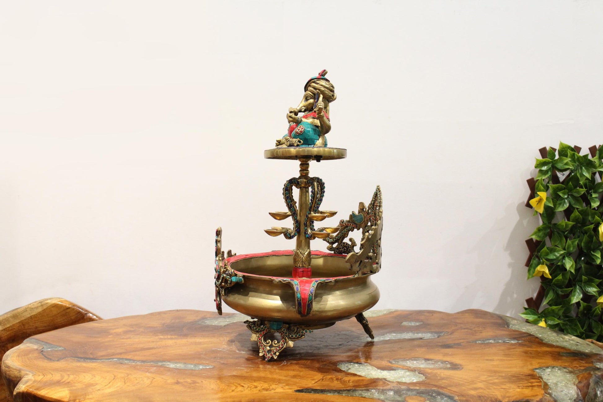Light up your space with our exquisite Ganpati Diya Urli. Made from the finest materials, this elegant piece will bring a touch of luxury and sophistication to any room. Perfect for adding warmth and ambiance to your home or as a unique gift for someone special.